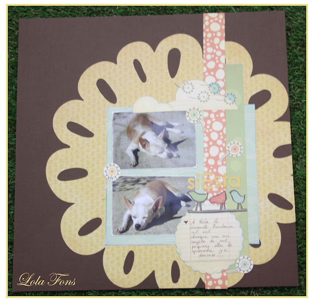 Con restos de hace mil años…jajaja, de Cosmo Cricket y Crate paper. Una página dedicada a mi perra y sus siestas al sol… Fotos lijadas y crónica escrita en un retal troquelado con los nuevos troqueles Framelits de Sizzix.