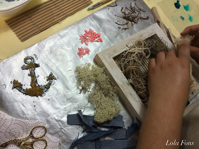 La base ha sido un marco de 20×20, decorado con gesso, acuarelas en tonos azules, sellos con motivos marinos y un fondo de cartón ondulado. Así hemos conseguido un mix de texturas muy interesante, que ha realzado la corona.