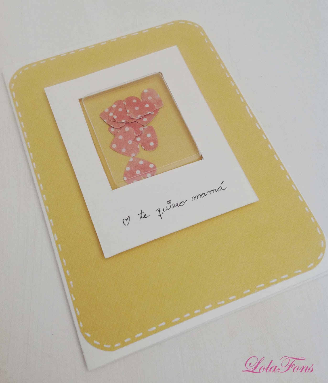 He recortado en una cartulina un rectangulo donde he vaciado el hueco donde va encajada la cajita de plástico transparente, imitando una foto Polaroid y he escrito un mensajito…Esto se pega con almohadillas adhesivas 3D para que tenga volumen y relieve.