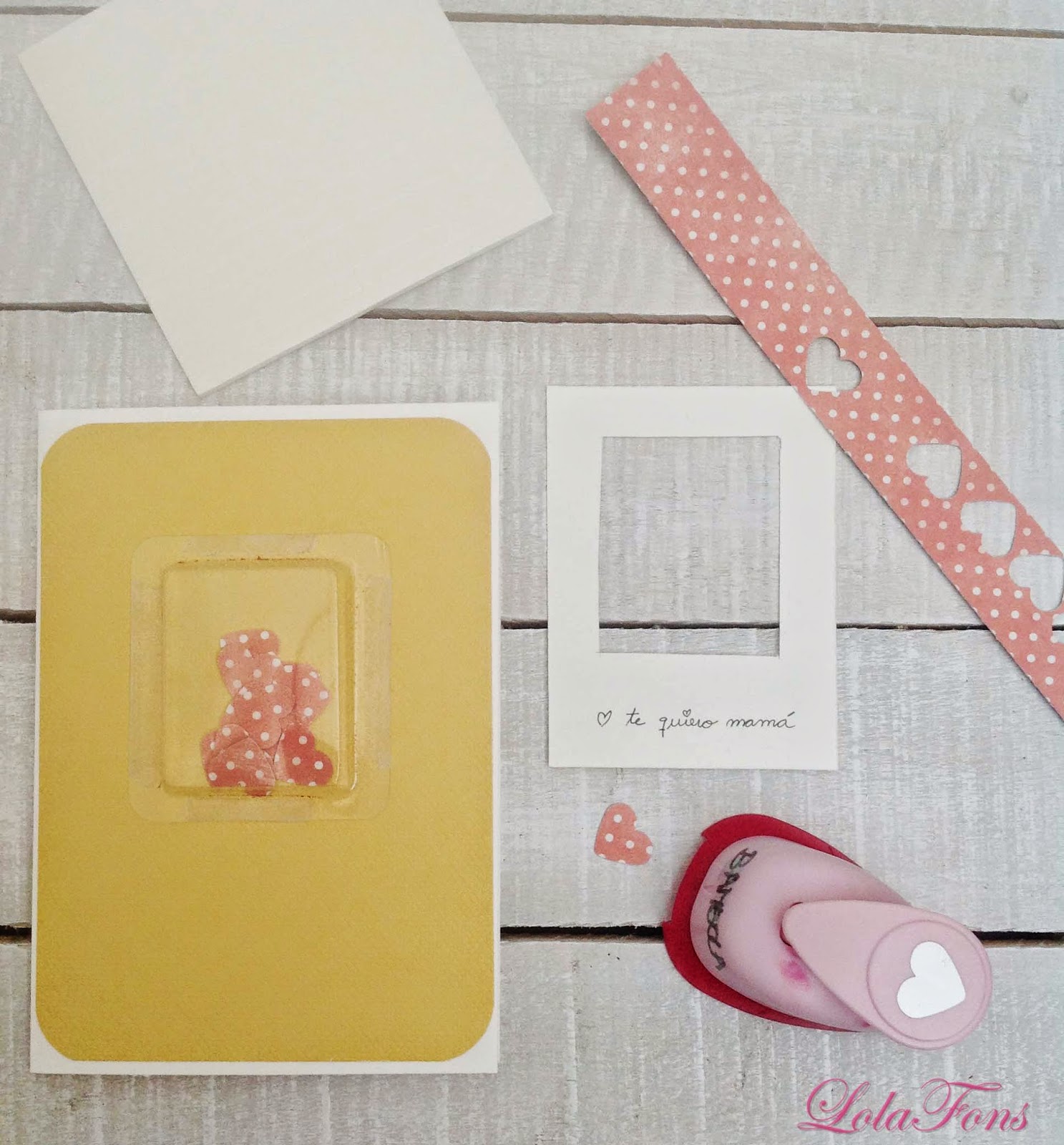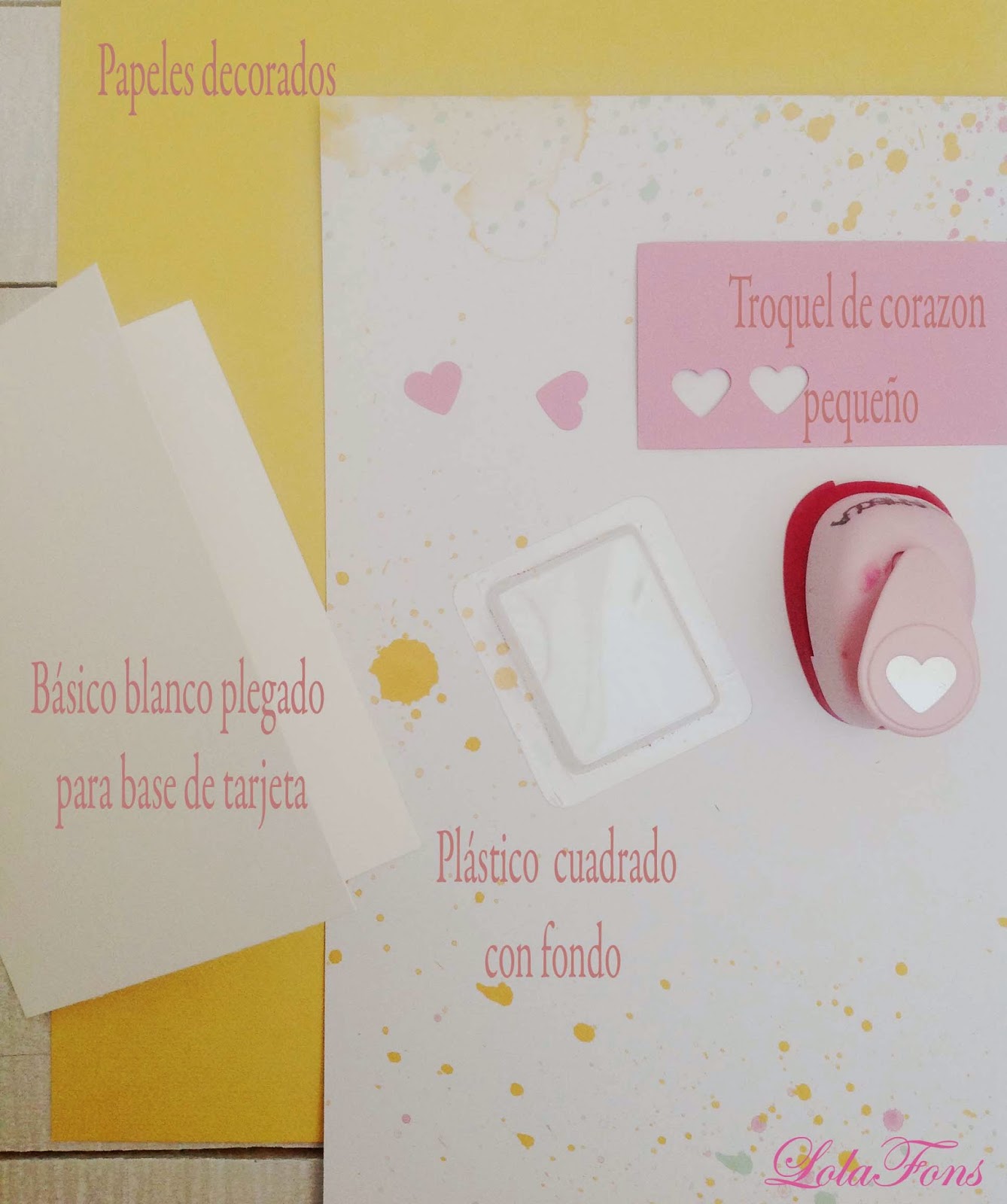 La estructura de la tarjeta en una cartulina básica blanca (8″1/2 x 5″1/2) plegada por la mitad, he pegado un papel de color amarillo. Luego he troquelado unos corazones, los he metido en el plástico y lo he pegado con cinta de doble cara.