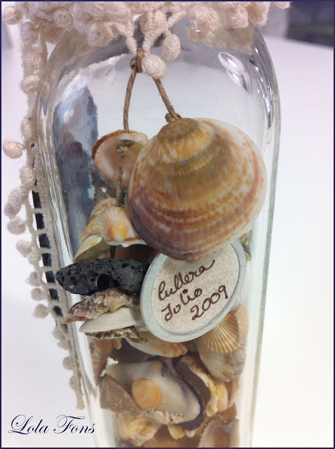 Cuando disfruto de un paseo por la playa, lo que más me gusta es recoger pequeñas conchas de la orilla del mar, tesoros que nos traen las olas, caracolas, piedrecitas pulidas, incluso trozos de nácar que brillan con el sol… cuando reúno muchos de esos «tesoros», los guardo en un tarro y lo decoro, pongo la fecha y el lugar donde lo recogí y aprovecho que algunas conchas tienen una pequeño orificio y las cuelgo… De esta manera atesoro conchas recogidas en playas diferentes.