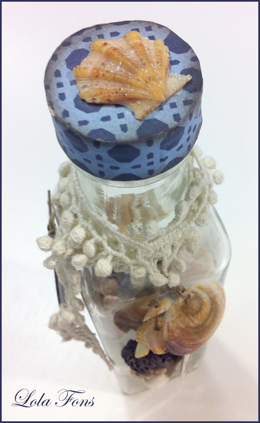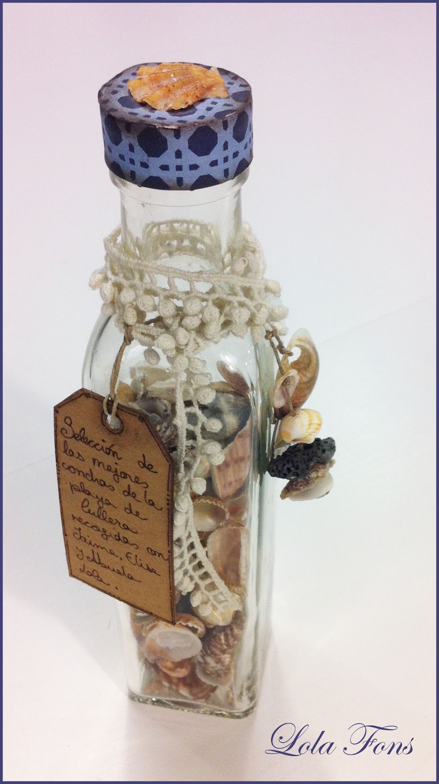 Cuando disfruto de un paseo por la playa, lo que más me gusta es recoger pequeñas conchas de la orilla del mar, tesoros que nos traen las olas, caracolas, piedrecitas pulidas, incluso trozos de nácar que brillan con el sol… cuando reúno muchos de esos «tesoros», los guardo en un tarro y lo decoro, pongo la fecha y el lugar donde lo recogí y aprovecho que algunas conchas tienen una pequeño orificio y las cuelgo… De esta manera atesoro conchas recogidas en playas diferentes.